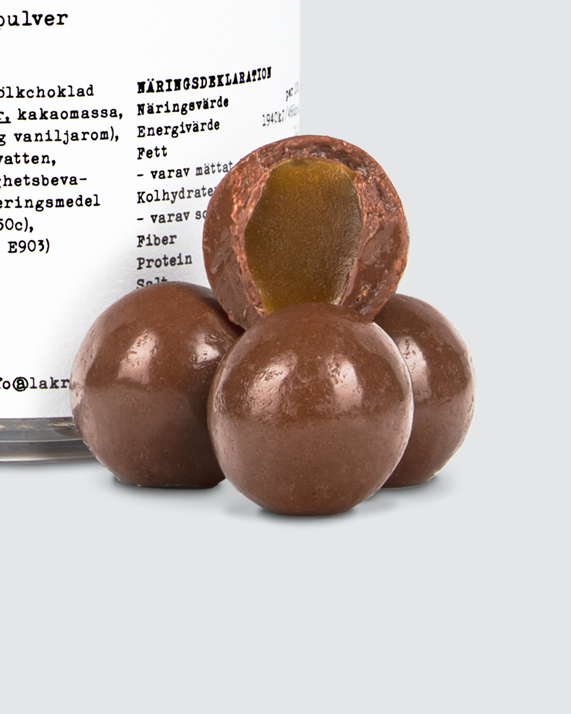 Caramel-flavoured candy coated in Belgian milk chocolate with salmiak powder.